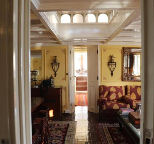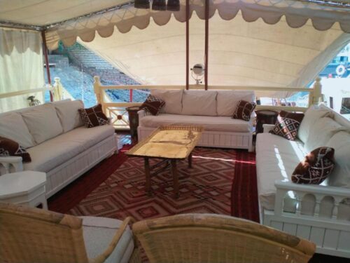 Saray El Nil is an original and rare dahabiya built in 1882 and restored in 2019. She is thirty-three metres from stem to stern and six metres across the beam. She is five metres from the keel to the sun deck. As with all traditional dahabiyas, Saray el Nil is a two-master and she also has a small stern sail. She has an original iron hull built in Scotland in 1882 and a hardwood sun deck, quarter deck and stern. Saray el Nil is towed by her tugboat, Saieed, when the wind is low but otherwise sails upstream with the northerly winds.