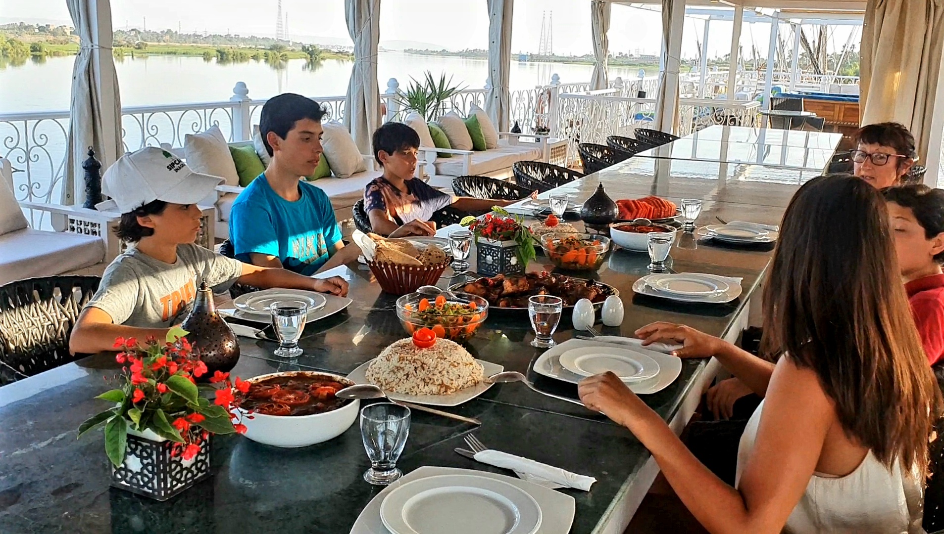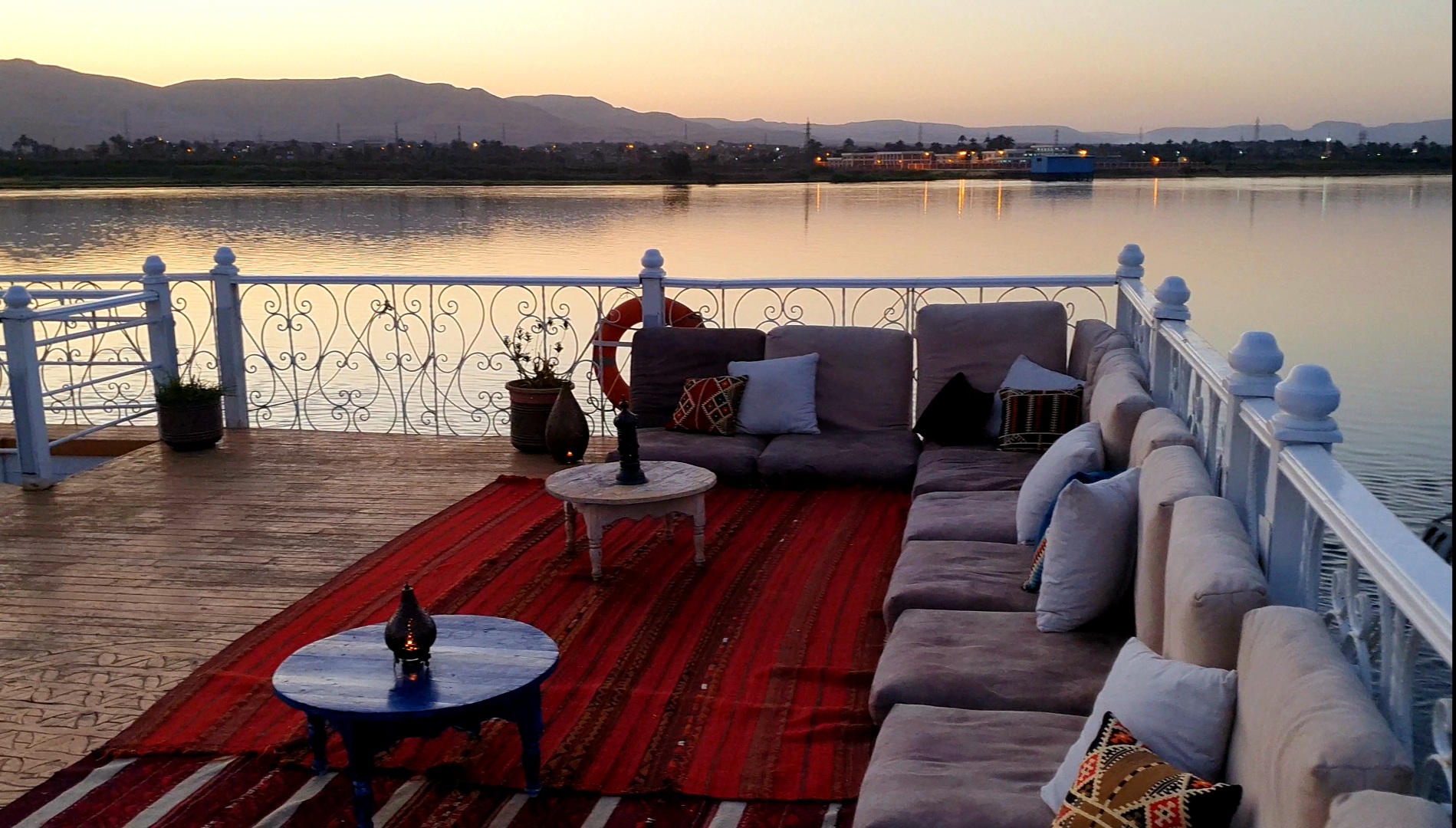 There are also several different Egyptian and Bedouin-style seating areas to sit back and enjoy the view of Egypt and life on the Nile River. If the weather turns a bit cold or windy there is also an indoor restaurant to dine in comfort.